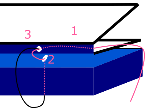 Um die Bindung zu beginnen, wird der erste Bogen mit dem ersten Buchdeckel verbunden. Dazu wird zuerst der Faden von innen durch das erste Loch des Bogens gezogen und dann von innen nach außen durch das entsprechende Loch im Buchdeckel und schließlich durch das selbe Loch in den ersten Bogen zurück