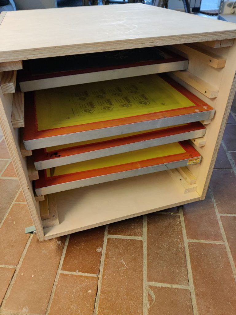 Um im Maschinenraum drucken zu können, musste ein Trockenschrank für Drucksiebe her, in den die vorhandenen A3+ und A3 Siebe passen.